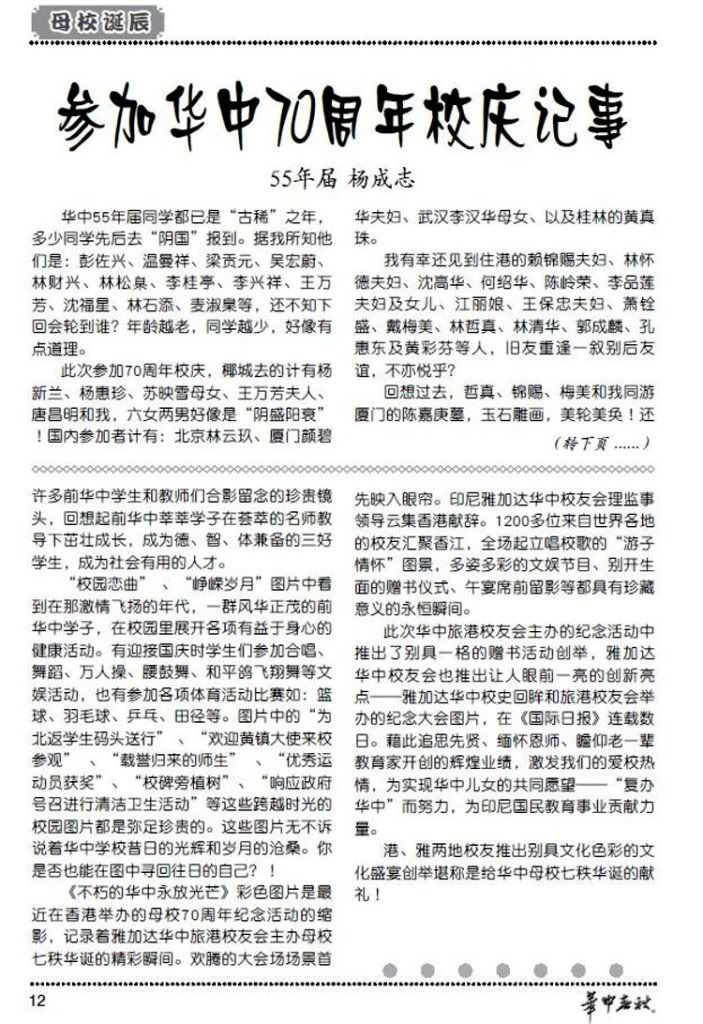雜談二則- 慶祝校慶70 周年活動後的兩件事..>1..>2.......................深圳程明生